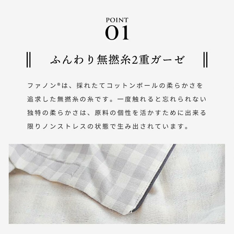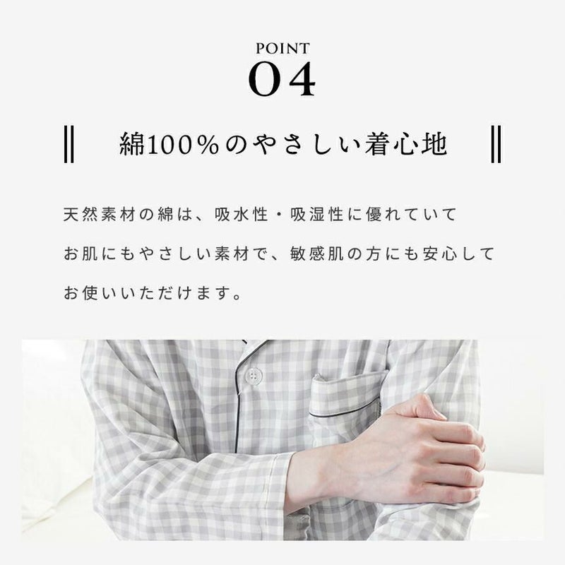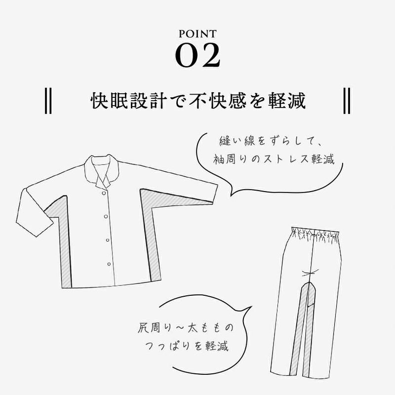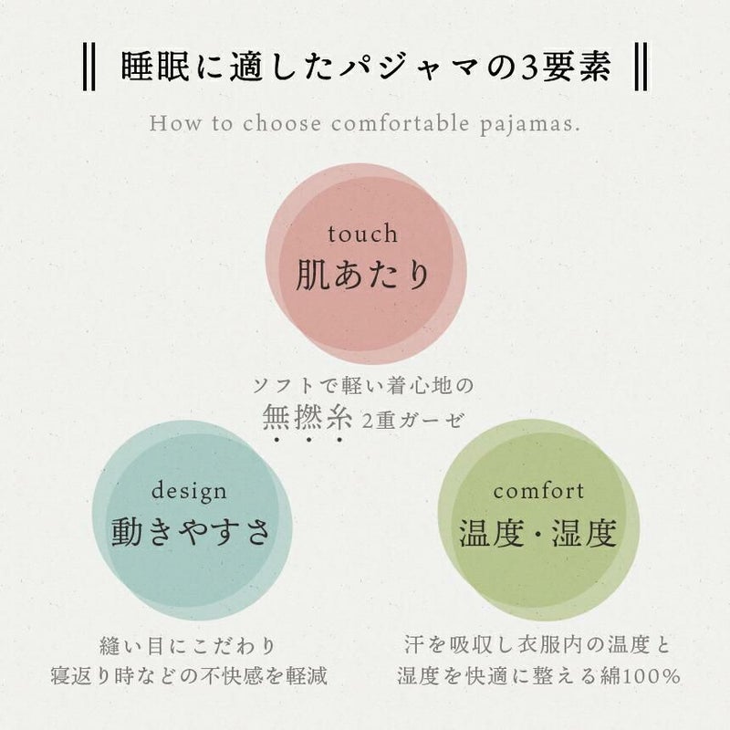 肌あたり…ソフトで肌触りが良く軽い着心地の無撚糸2重ガーゼ。 動きやすさ…縫い目にこだわることで寝返り時などの不快感を軽減。 温度・湿度…汗を吸収し衣服内の温度と湿度を快適に整える綿100%。