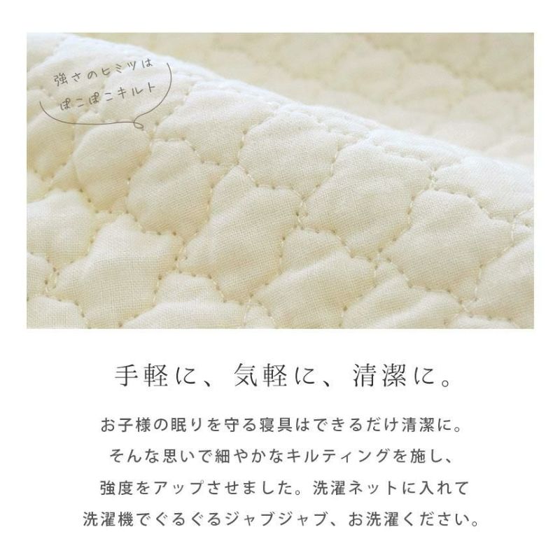 毎日毎日、たっぷり汗や皮脂・汚れを吸収している寝具たち。夏場はさらに湿気でベタつきが出て不快になりがち。お子さまの眠りを守る寝具は、少しでも清潔でありたい。それも、ママパパになるべく負担を掛けずに。そんな気持ちで細かく繊細なキルティングを施しました。ぐるぐるジャブジャブ洗濯機で洗っても、中わたの片寄りを防いでくれます。