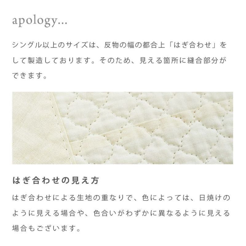 通常、キルトケットの詰め物にはポリエステルがよく使われていますが、この商品は、綿(コットン)を使用。コットンわたの吸水性はポリエステルの約21倍。コットンに特殊な加工を施して紡がれたレーヨンわたと、寝具は毎日あなたの眠りを支えるものだから、少しだけ強さの為に化学繊維をプラス。優し風合い、綿の吸水性をほとんどそのままにコストダウンにも、成功しました。