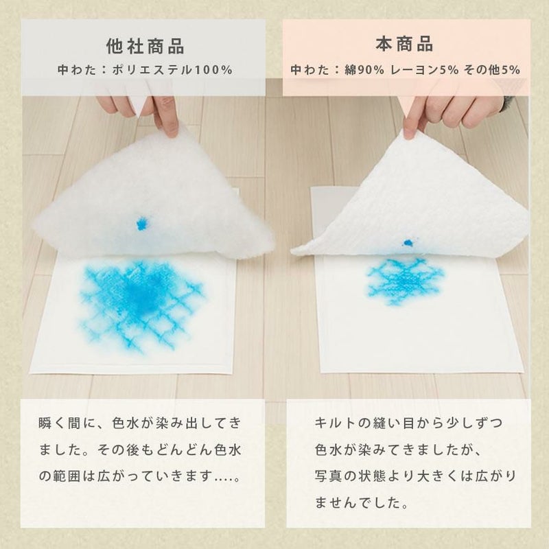 通常、キルトケットの詰め物にはポリエステルがよく使われていますが、この商品は、綿(コットン)を使用。コットンわたの吸水性はポリエステルの約21倍。コットンに特殊な加工を施して紡がれたレーヨンわたと、寝具は毎日あなたの眠りを支えるものだから、少しだけ強さの為に化学繊維をプラス。優し風合い、綿の吸水性をほとんどそのままにコストダウンにも、成功しました。