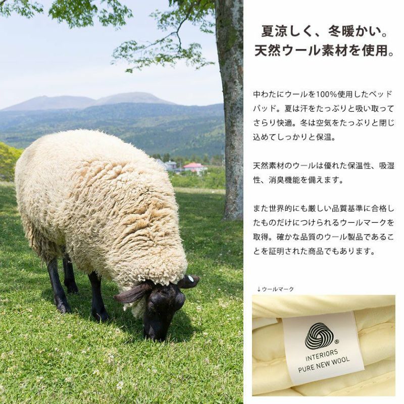 中綿にウールを100%使用したベッドパッド。夏は汗をたっぷりと吸い取ってさらり快適。冬は空気をたっぷりと閉じ込めてしっかりと保温。天然素材のウールは優れた保温性、吸湿性、消臭機能を備えます。