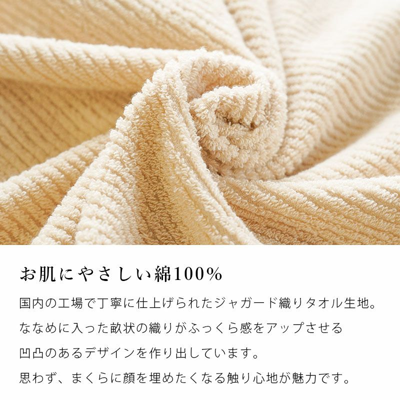 国内の工場で丁寧に仕上げられたジャガード織りのタオル生地を使用。ななめに入った畝状の織りがふっくら感をアップさせる凹凸のあるデザインを作り出しています。思わず、まくらに顔を埋めたくなる触り心地が魅力です。