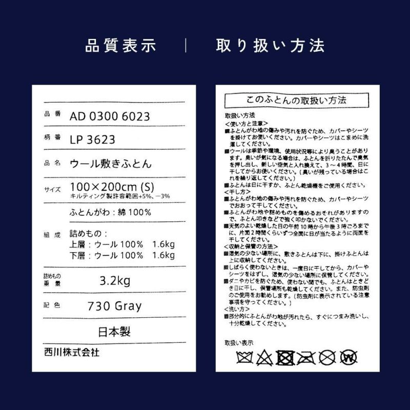 ふっくらと包み込むやわらかめの敷き布団のため、下にマットレスを敷くなどの併用をおすすめしております。ウール100%なので蒸れにくく快適です。ハイクオリティの西川・日本製で、普段使いはもちろん、来客用にもおすすめです。