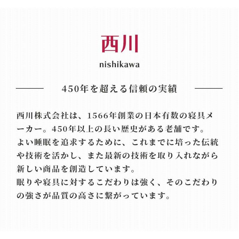 西川株式会社は、1566年創業の日本有数の寝具メーカー。450年以上の長い歴史がある老舗です。よい睡眠を追求するために、これまでに培った伝統や技術を活かし、また最新の技術を取り入れながら新しい商品を創造しています。眠りや寝具に対するこだわりは強く、そのこだわりの強さが品質の高さに繋がっています。