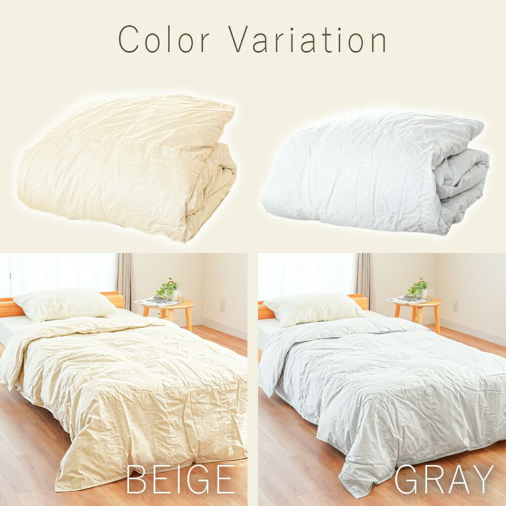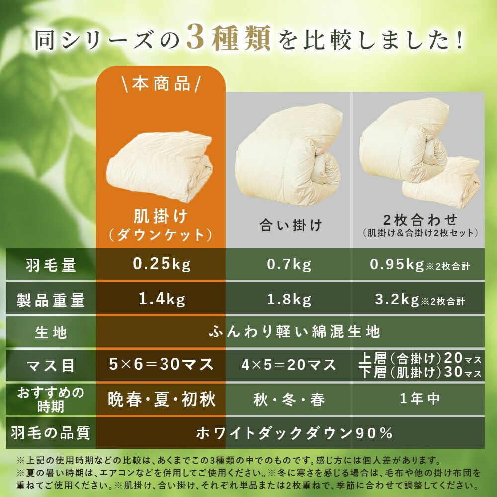 中わたに、吸湿・放湿性に優れた羽毛を使用した夏用の薄い掛け布団です。温度調節に優れている為、エアコンによる冷えや、朝晩少し冷えるようになってくる季節などの調節にピッタリ。