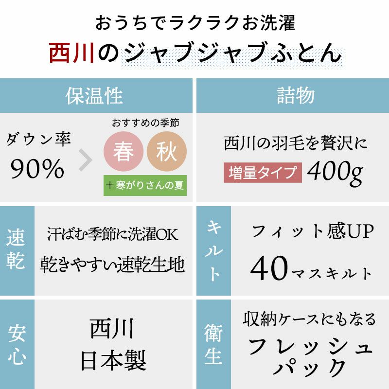西川の良質な羽毛をたっぷりと贅沢に400g使用しています。通常のダウンケットに比べて、保温力に優れているため、長期間お使いいただけます。冷房からの冷え対策や、春・秋の肌寒い季節での使用に最適。特に寒がりさんにおすすめです。