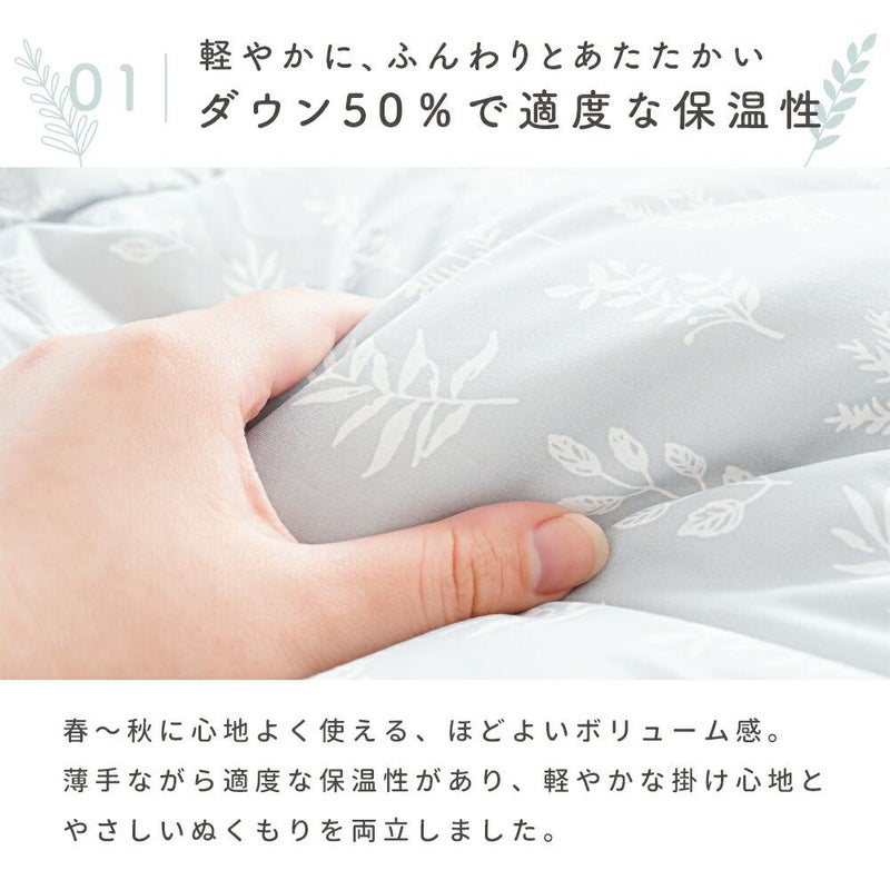 エアコンの冷気を防ぎつつ、ムレを逃がすのが羽毛の力です。詰め物にダウン50%を0.25kg使用しており、薄手ながらもしっかりとした適度な保温性を発揮。夏の夜の寝冷え対策に最適で、冷房と上手に付き合いながら朝までぐっすり眠れます。
