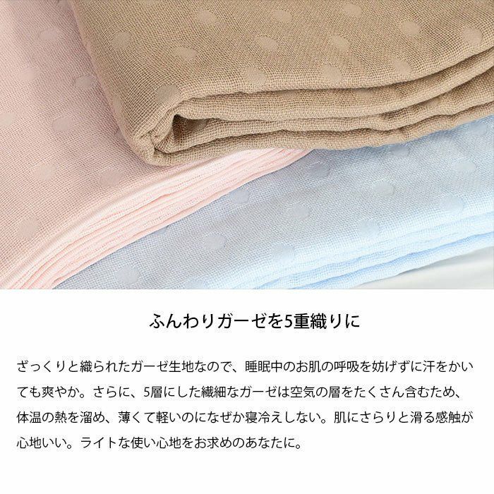 ガーゼは速乾性・通気性に優れた素材ですので、汗をかいてもすぐに吸収・発散。さわやかな使い心地です。5重ガーゼだから、肌触りもよくほどよい保温性を発揮いたします!