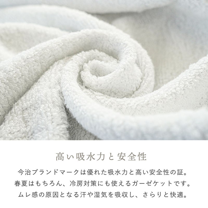 今治ブランドマークは優れた吸水力と高い安全性の証。春夏はもちろん、冷房対策にも使えるガーゼケットです。ムレ感の原因となる汗や湿気を吸収し、さらりと快適。