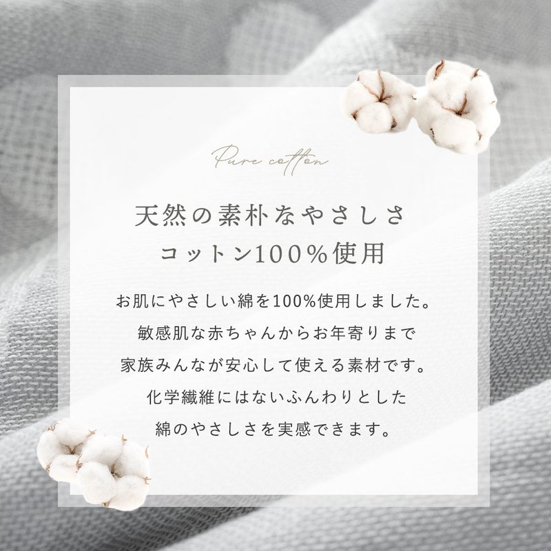 お肌にやさしい綿を100%使用しました。敏感肌な赤ちゃんからお年寄りまで家族みんなが安心して使える素材です。化学繊維にはないふんわりとした綿のやさしさを実感できます。