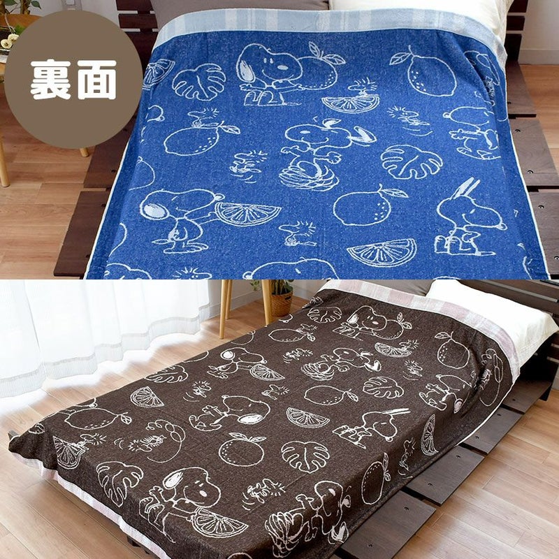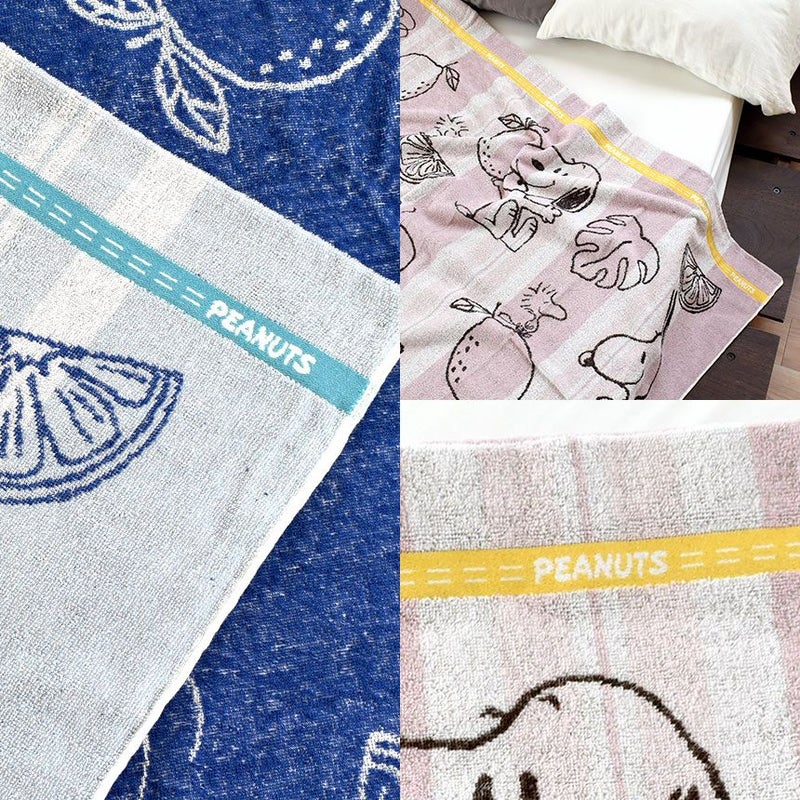スヌーピーとフルーツが描かれた愛らしいデザインのタオルケット。