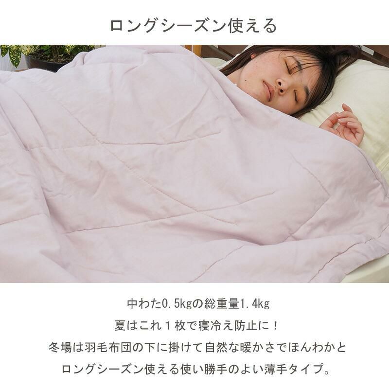 中わた0.5kgの総重量1.4kg 夏はこれ1枚で寝冷え防止に!冬場は羽毛布団の下に掛けて自然な暖かさでほんわかとロングシーズン使える使い勝手のよい薄手タイプ。