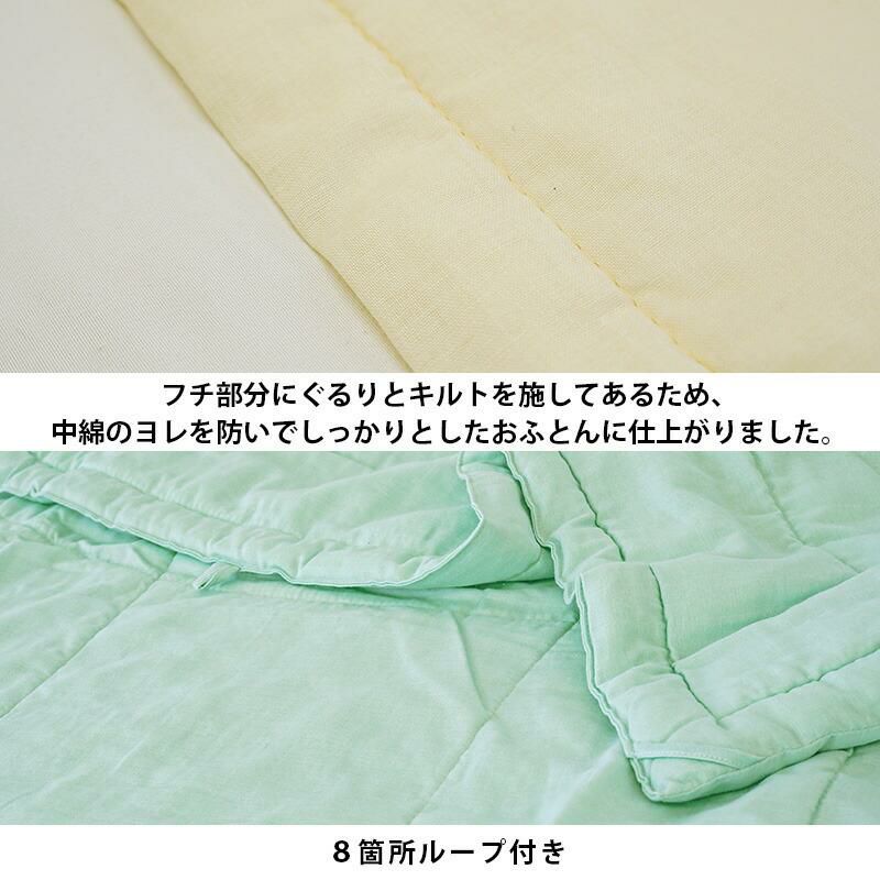側生地には綿100%のダブルガーゼ生地を使用。ダブルガーゼのもつやさしい風合いが、真綿の良さを引き立てます。 カバーを掛けて使う場合、カバーとお布団が滑りにくいのもダブルガーゼの特徴です。