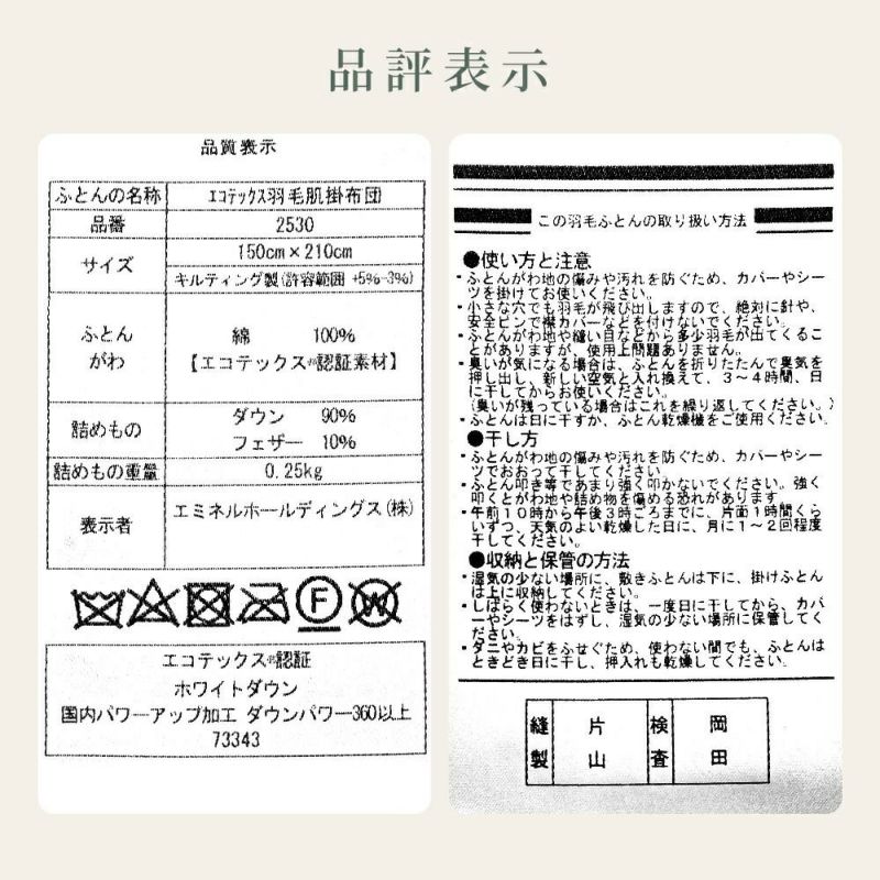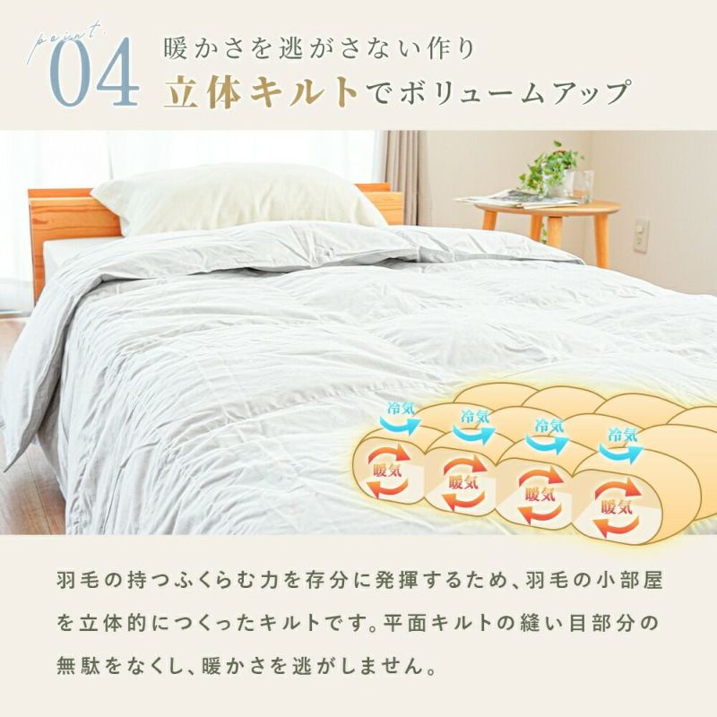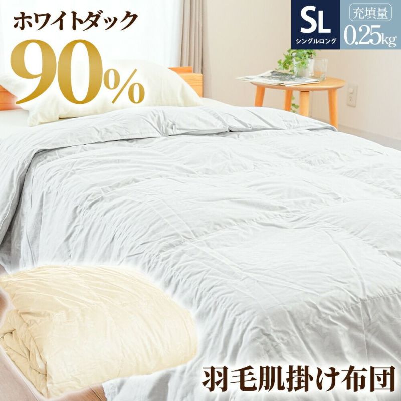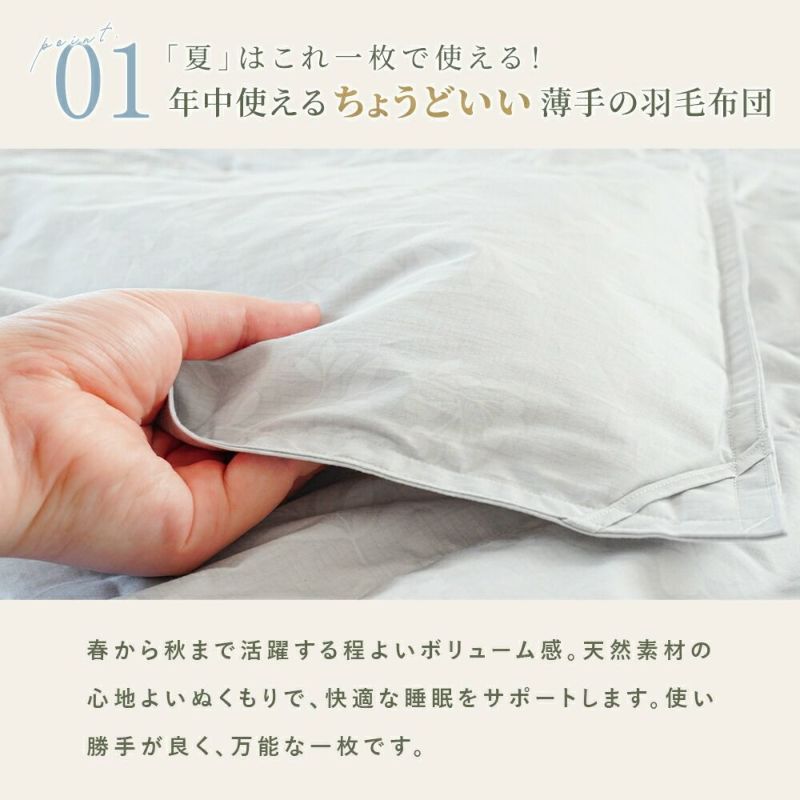 厳選したホワイトダックダウンを使用しています。ダウン率は90%、詰め物量0.25kg、ダウンパワー360dp以上です。高ランクの羽毛布団にも負けないかさ高性と保温力があります。また、国内パワーアップ加工でふっくら清潔な羽毛に仕上げています。圧縮されて輸入される羽毛を専用の機械にかけ、蒸気や熱の力でゴミやダニ・細菌を消滅させ羽毛本来のふわふわな状態に復元させました。 軽やかな掛け心地と確かな暖かさを実現。薄手ながらも、優れた保温性を発揮しています。薄手でもしっかりとした保温力を求める方や、エアコンの寝冷え対策などにおすすめです。