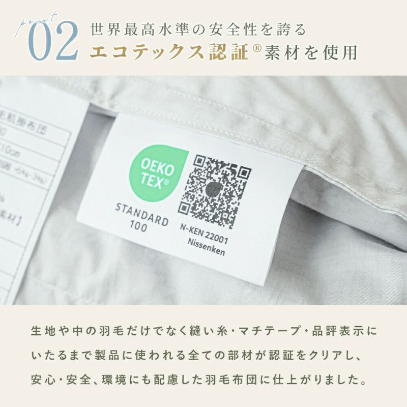 エコテックス®とは、人と地球にやさしい繊維製品の証。原料から製造工程まで安全性を厳しくチェックし、未来の環境やこどもたちを守ります。またエコテックス®は、製品づくりを通じてSDGsの目標達成にも貢献しています。選ぶことが、未来の地球やこどもの笑顔を守る一歩にもなります。 この製品は、そんな世界最高水準の安全性を誇る、エコテックス®認証素材を使用しています。 生地や中の羽毛だけでなく縫い糸・マチテープ・品評表示にいたるまで製品に使われる全ての部材が認証をクリアし、安心・安全、環境にも配慮した羽毛布団に仕上がりました。毎日身体に触れるものだからこそ、安心・安全な世界最高水準の羽毛布団を選びませんか。