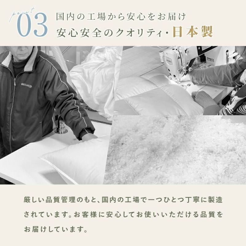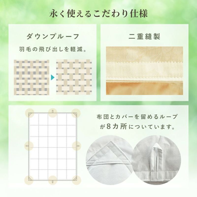 羽毛の飛び出しを軽減する「ダウンプルーフ加工」に加え、縫製部分も丈夫な「二重縫製」。毎日使うものだからこそ、見えない部分にもこだわった、長く使える安心の設計です。