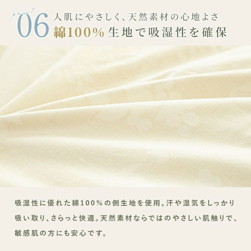 吸湿性に優れた綿100%の側生地を使用。汗や湿気をしっかり吸い取り、さらっと快適。天然素材ならではのやさしい肌触りで、敏感肌の方にも安心です。
