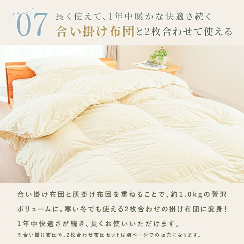 季節に応じた使い方ができます。夏は1枚で快適。 春秋は別売りの合い掛け布団と組み合わることで、肌寒い時期も丁度いい温もりに。合い掛け布団と肌掛け布団を重ねることで、約1.0kgの贅沢ボリュームになり、寒い冬でも使える2枚合わせの掛け布団に変身します。 冬は掛け布団と重ねて、毛布も併用すればさらにあったか。一年中快適さが続き、長くお使いいただけます。 ※肌掛け布団や、2枚合わせ布団セットは別ページでの販売になります。