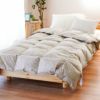 羽毛布団に使われる「羽毛」というのは、誰もが良く知る羽根ではなく、水鳥の胸毛や腹毛のなかでも特に柔らかい部分を採取するたんぽぽの綿毛のような「ダウン」のこと。 貴重なダウンを90%配合した布団は、しっかりと空気を含んで暖かい。冷房からの冷え対策や、春・秋の肌寒い季節での使用に最適。特に寒がりさんにおすすめです。