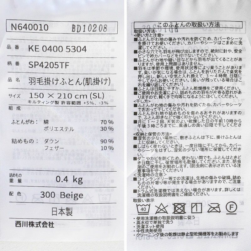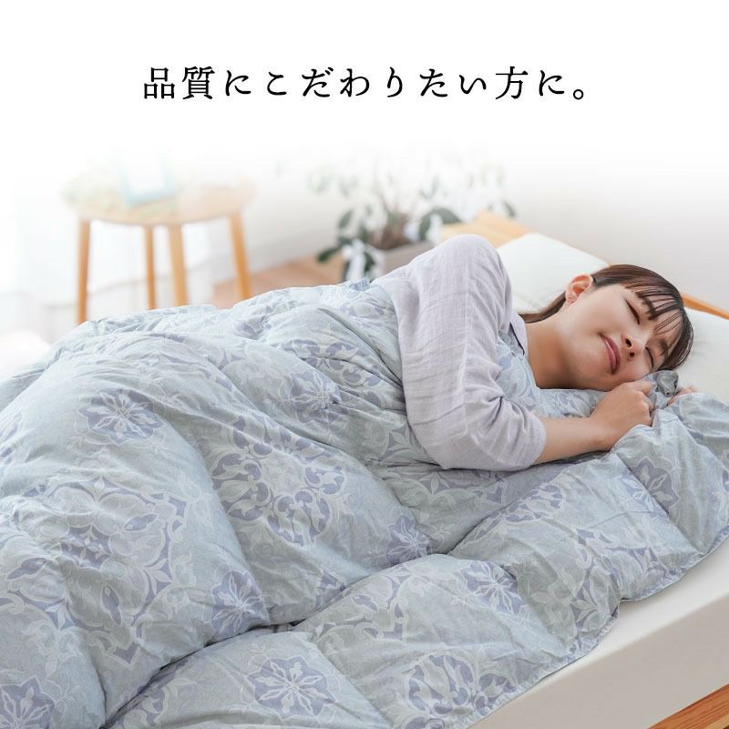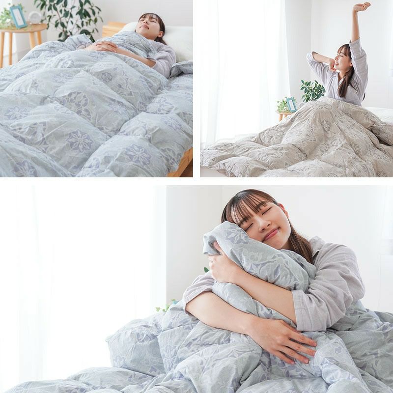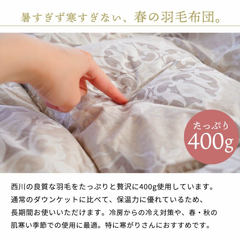 西川の良質な羽毛をたっぷりと贅沢に400g使用しています。通常のダウンケットに比べて、保温力に優れているため、長期間お使いいただけます。冷房からの冷え対策や、春・秋の肌寒い季節での使用に最適。特に寒がりさんにおすすめです。