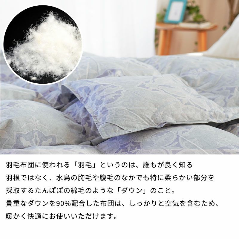 羽毛布団に使われる「羽毛」というのは、誰もが良く知る羽根ではなく、水鳥の胸毛や腹毛のなかでも特に柔らかい部分を採取するたんぽぽの綿毛のような「ダウン」のこと。 貴重なダウンを90%配合した布団は、しっかりと空気を含んで暖かい。冷房からの冷え対策や、春・秋の肌寒い季節での使用に最適。特に寒がりさんにおすすめです。