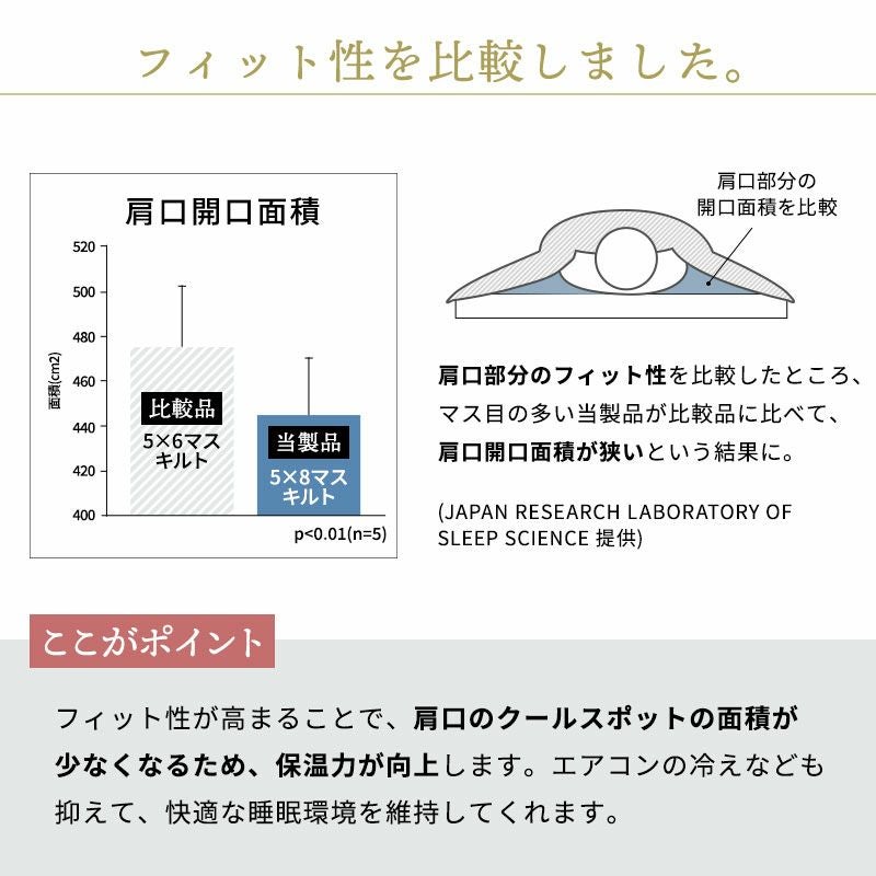 一般的な30マス(5×6マス)より10個のマスを増やした、40マス(5×8マス)を採用しました。細かく分かれているので、繰り返し洗っても洗濯後の羽毛が片寄りにくく、フィット性も向上するので、肌寒い日もほどよく保温します。