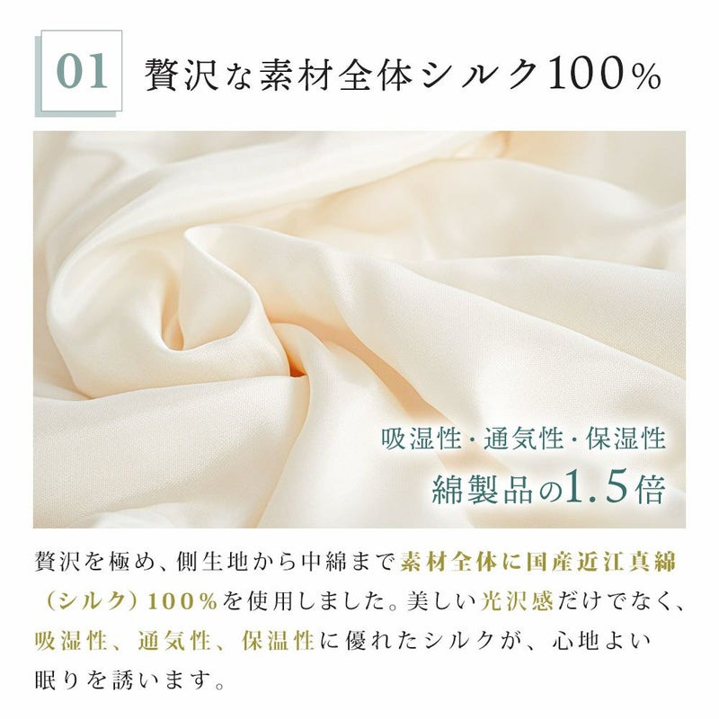 贅沢を極め、側生地から中綿まで素材全体に国産近江真綿(シルク)100%を使用しました。美しい光沢感だけでなく、吸湿性、通気性、保温性に優れたシルクが、心地よい眠りを誘います。