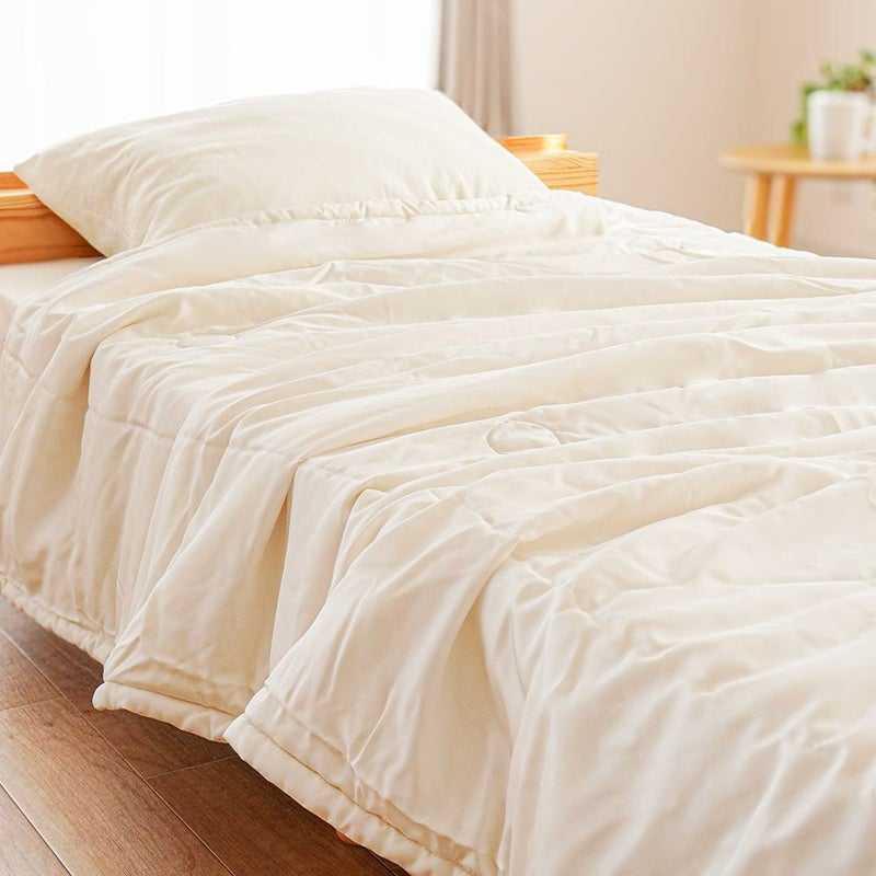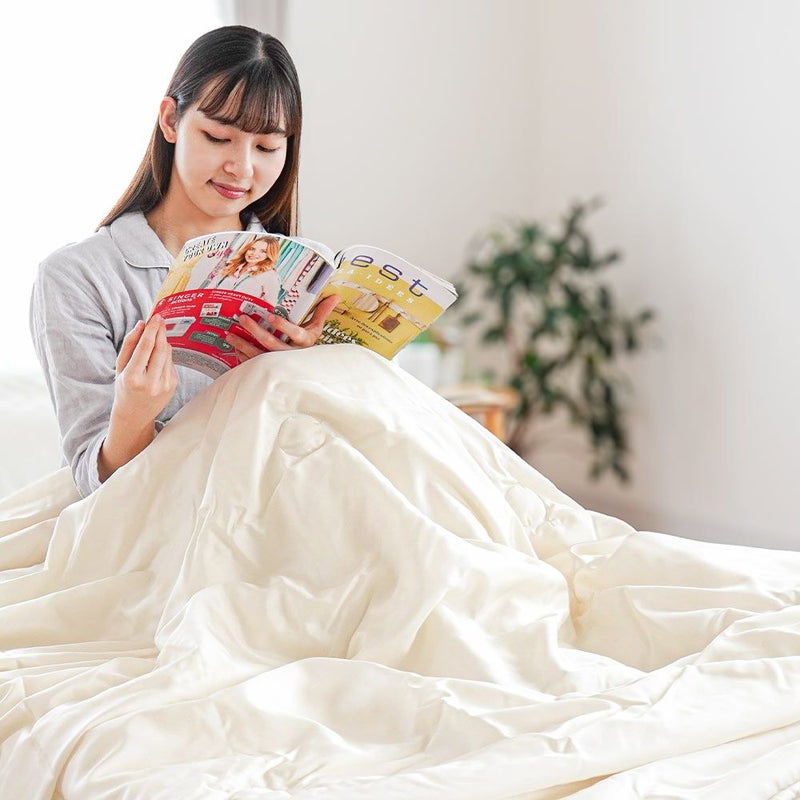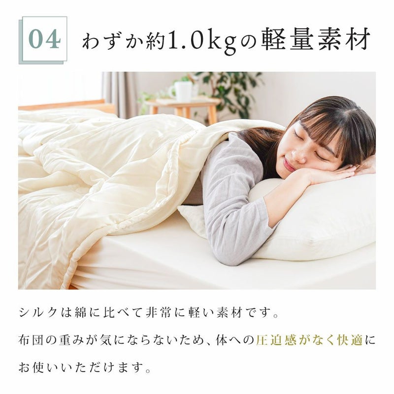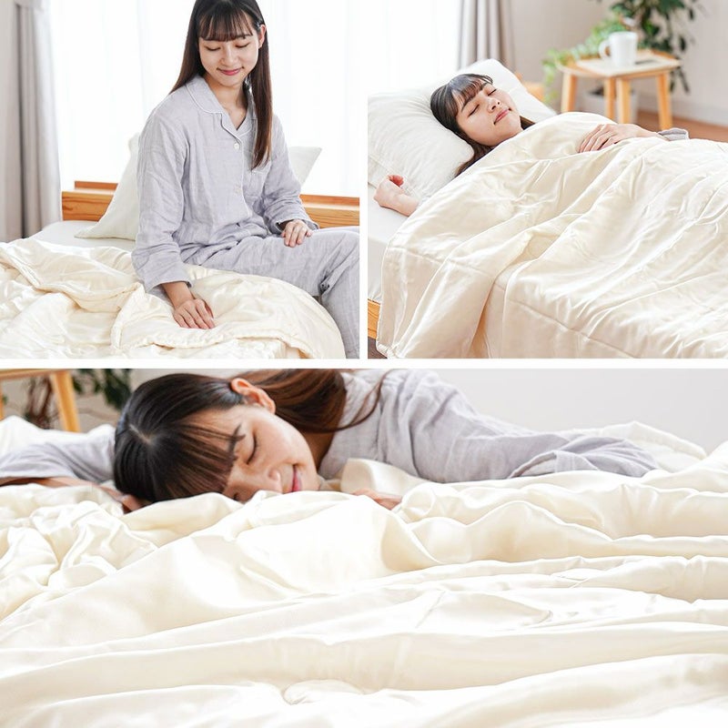 シルクは綿に比べて非常に軽い素材です。布団の重みが気にならないため、体への圧迫感がなく、快適にお使いいただけます。