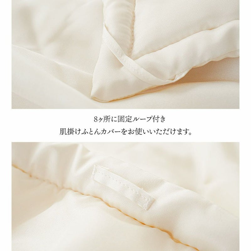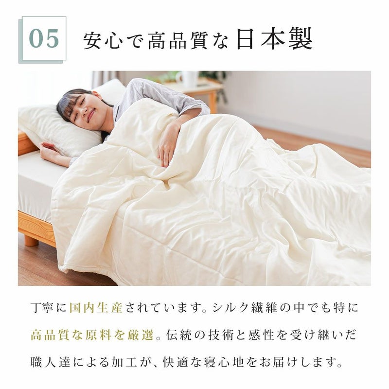 シルクは天然繊維の中で最も細く最も長い繊維であり、吸湿性は綿の約1.5倍。ムレ感がなく爽やかで夏も冬も常に快適にご使用いただけます。夏は1枚で、冬は中掛けふとんとしてもあたたかくお使いいただけます。