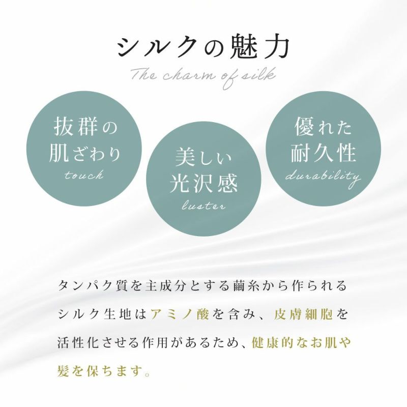 タンパク質を主成分とする繭糸から作られるシルク生地はアミノ酸を含み、皮膚細胞を活性化させる作用があるため、健康的なお肌や髪を保ちます。