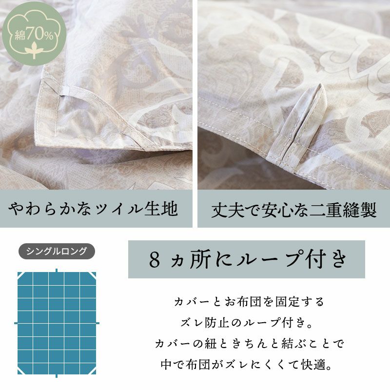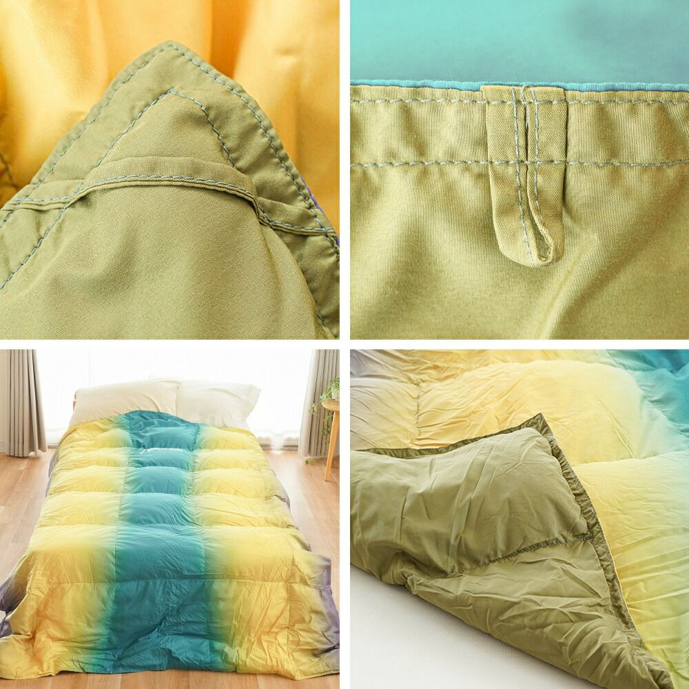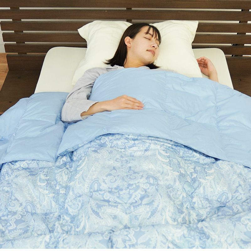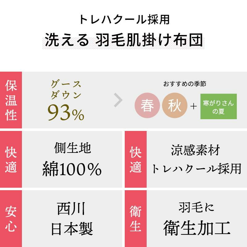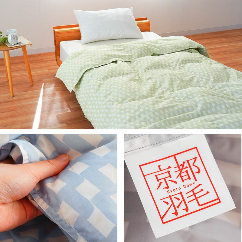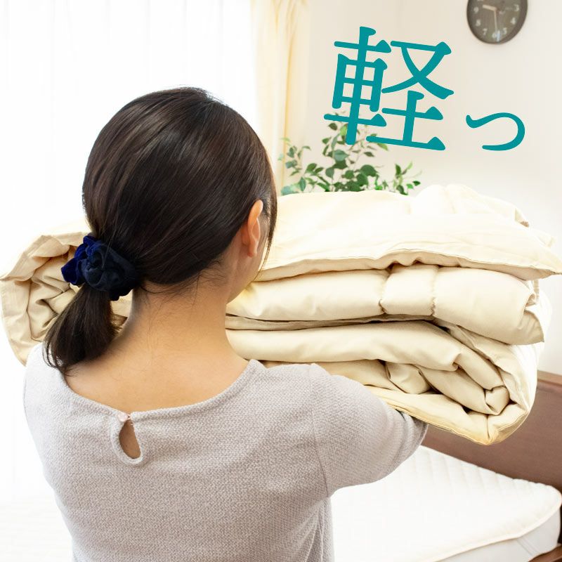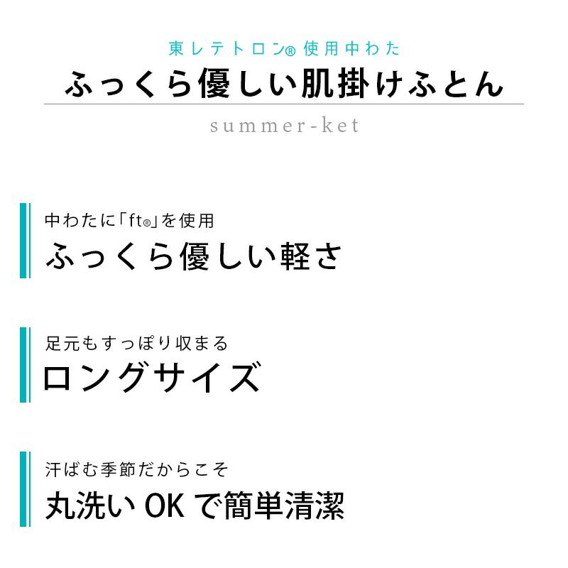 中わたに、吸湿・放湿性に優れた羽毛を使用した夏用の薄い掛け布団です。温度調節に優れている為、エアコンによる冷えや、朝晩少し冷えるようになってくる季節などの調節にピッタリ。