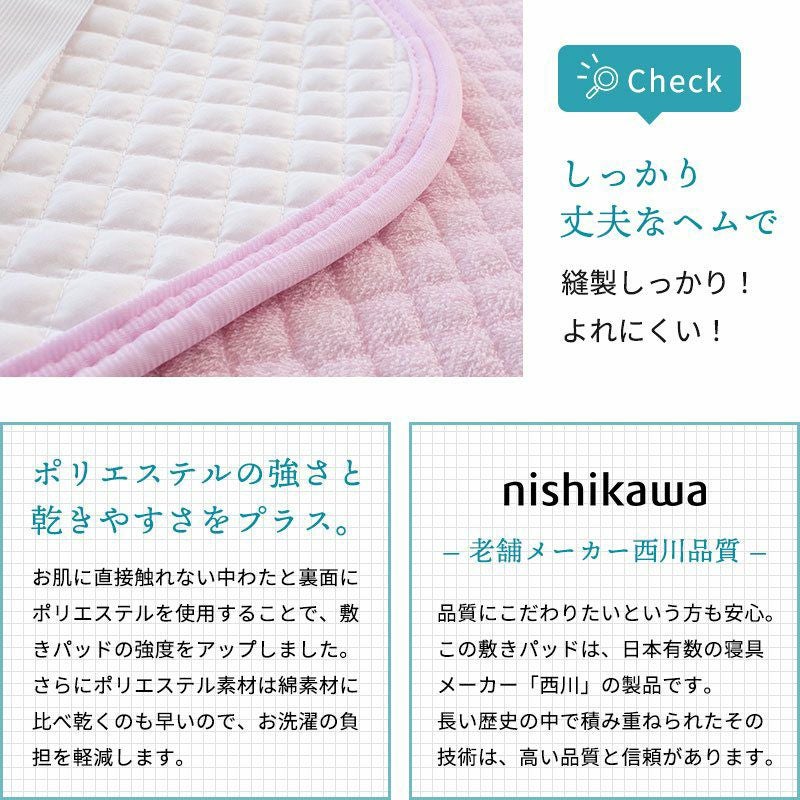 綿100%のパイルが汗をしっかり吸収!寝具の老舗メーカー西川製、タオルのような優しい触れ心地の敷きパッド。