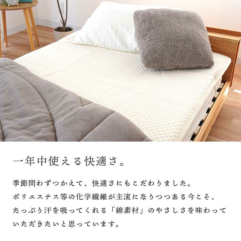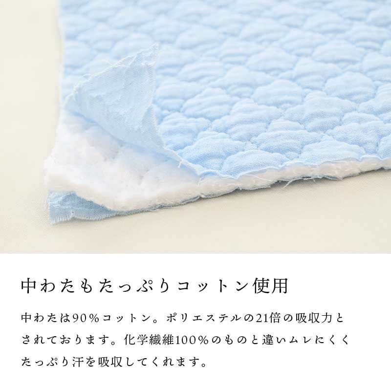通常、敷パッドの詰め物にはポリエステルを使用しますが、この商品は、綿(コットン)を使用。コットンわたの吸水性はポリエステルの約21倍。コットンに特殊な加工を施して紡がれたレーヨンわたと、寝具は毎日あなたの眠りを支えるものだから、少しだけ強さの為に化学繊維をプラス。優し風合い、綿の吸水性をほとんどそのままにコストダウンにも、成功しました。