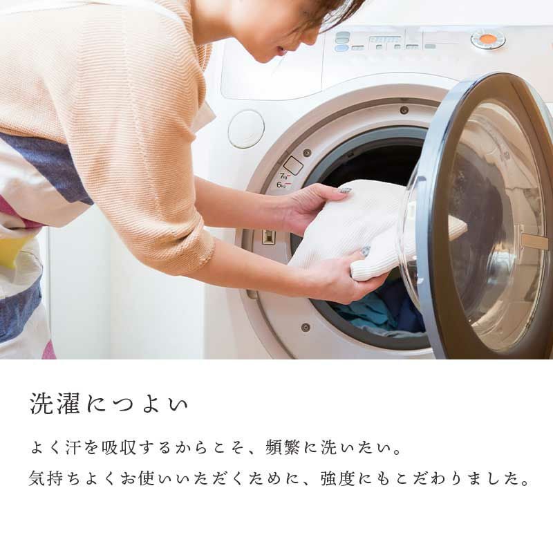 コットンは伸縮性を持った素材ですので、どうしてもお洗濯・乾燥等の間に縮んでしまうことが良くあります。だから、生地をカット・縫製・仕上げをする前に1度水に濡らす一手間を加えました。収縮してしまった生地から作っているため、製品が極端に変形してしまうのを防ぎ、また一度水にさらされた生地はより馴染みが早く、初めてのご使用でもほっとする使用感です。