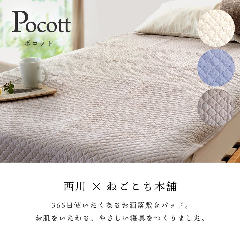 西川とのコラボレーションにより、当社オリジナルの敷きパッドができました。ポコポコとしたキルティングがキュート。綿100%の水洗いキルトを使った、お肌をいたわるやさしい寝具。