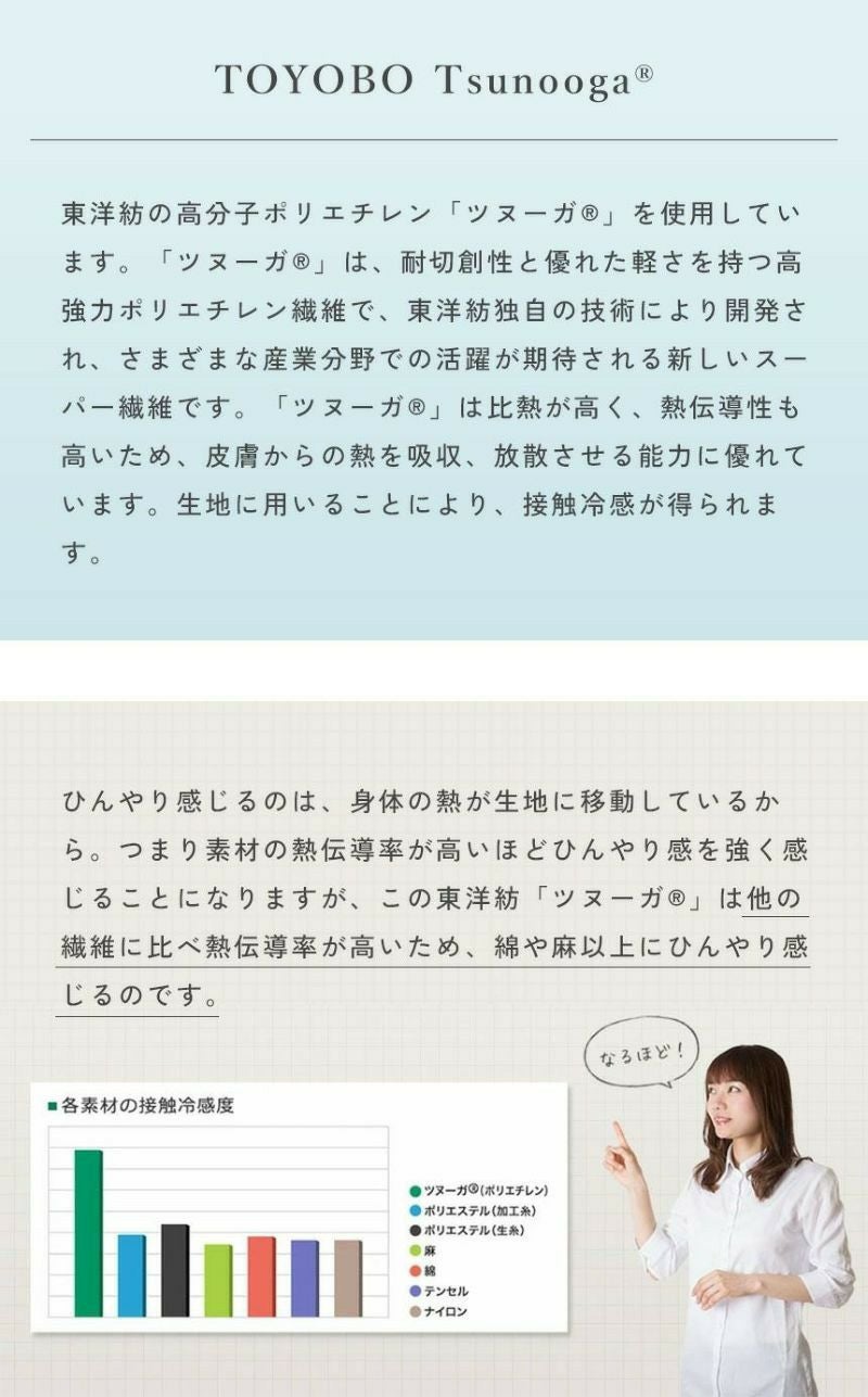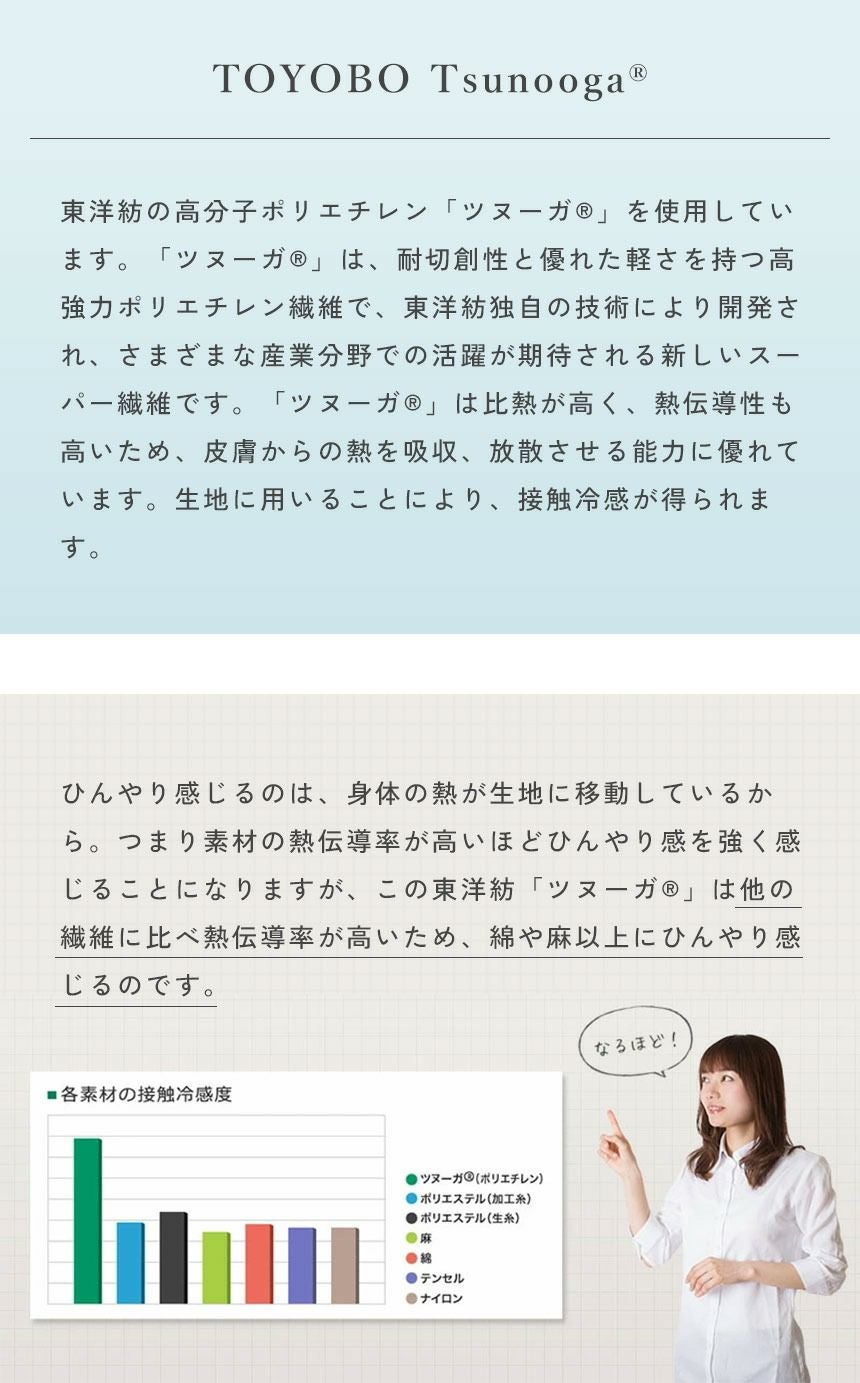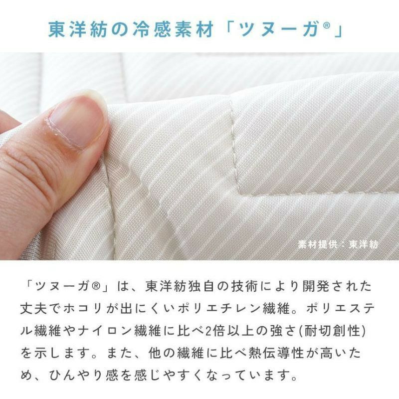 ツヌーガ®は東洋紡独自の技術で開発された丈夫でホコリのでにくい繊維です。熱伝導性が高いのでひんやり感を感じやすいのが特徴です。