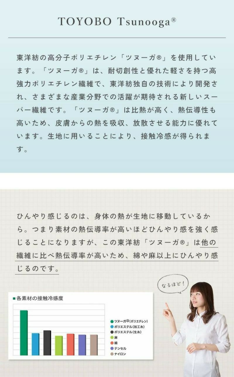 「ツヌーガ®」は、東洋紡独自の技術により開発された丈夫でホコリが出にくいポリエチレン繊維です。ポリエステル繊維やナイロン繊維に比べ2倍以上の強さ(耐切創性)を示します。また、他の繊維に比べ熱伝導性が高いため、ひんやり感を感じやすくなっています。