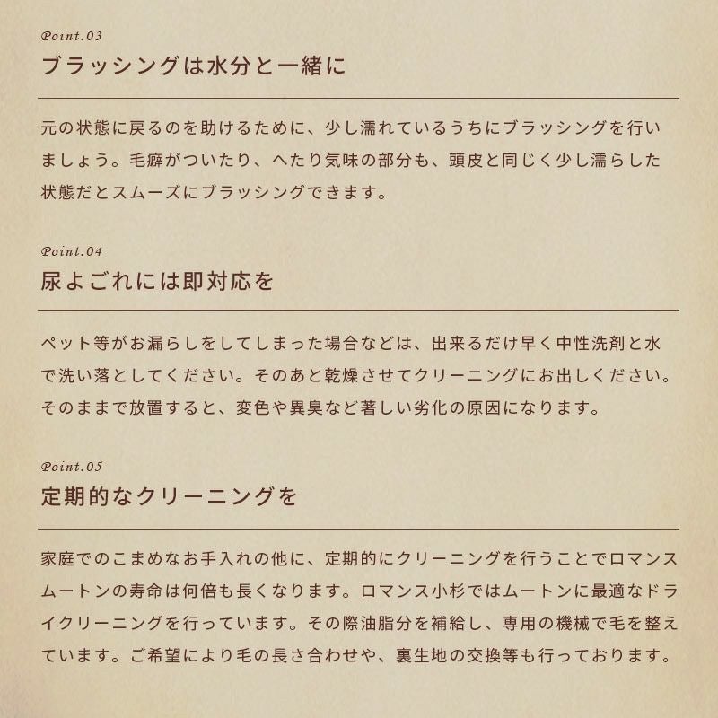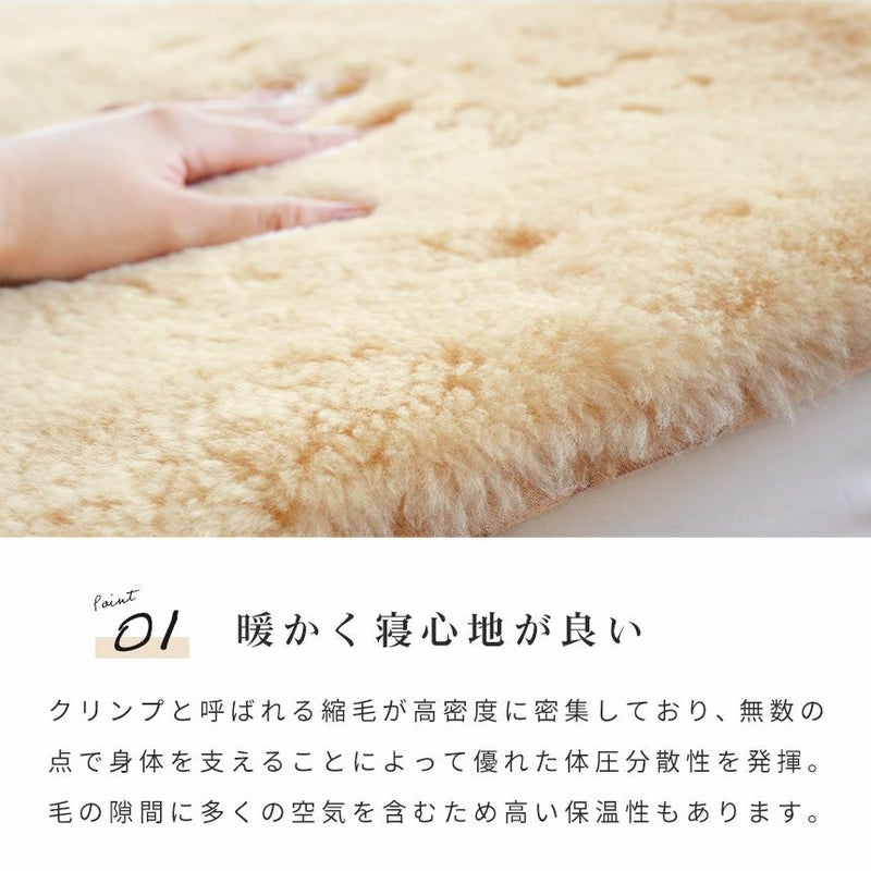 クリンプと呼ばれる縮毛が高密度に密集しており、無数の点で身体を支えることによって優れた体圧分散性を発揮。毛の隙間に多くの空気を含むため高い保温性もあります。