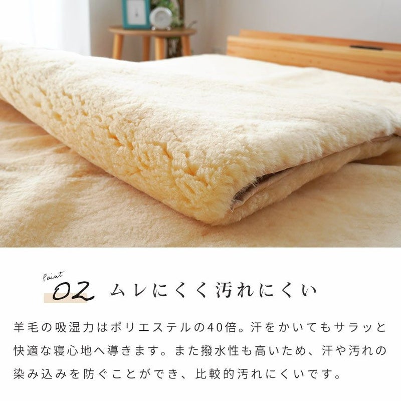 羊毛の吸湿力はポリエステルの40倍。汗をかいてもサラッと快適な寝心地へ導きます。また撥水性も高いため、汗や汚れの染み込みを防ぐことができ、比較的汚れにくいです。