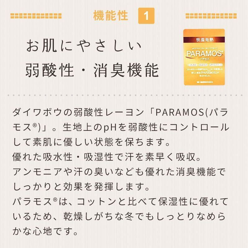 ダイワボウの弱酸性レーヨン「PARAMOS(パラモス)」。生地上のpHを弱酸性にコントロールして素肌に優しい状態を保ちます。優れた吸水性・吸湿性で汗を素早く吸収。アンモニアや汗の臭いなども優れた消臭機能でしっかりと効果を発揮します。パラモスは、保湿性に優れているため、乾燥しがちな冬でもしっとりなめらかな心地です。