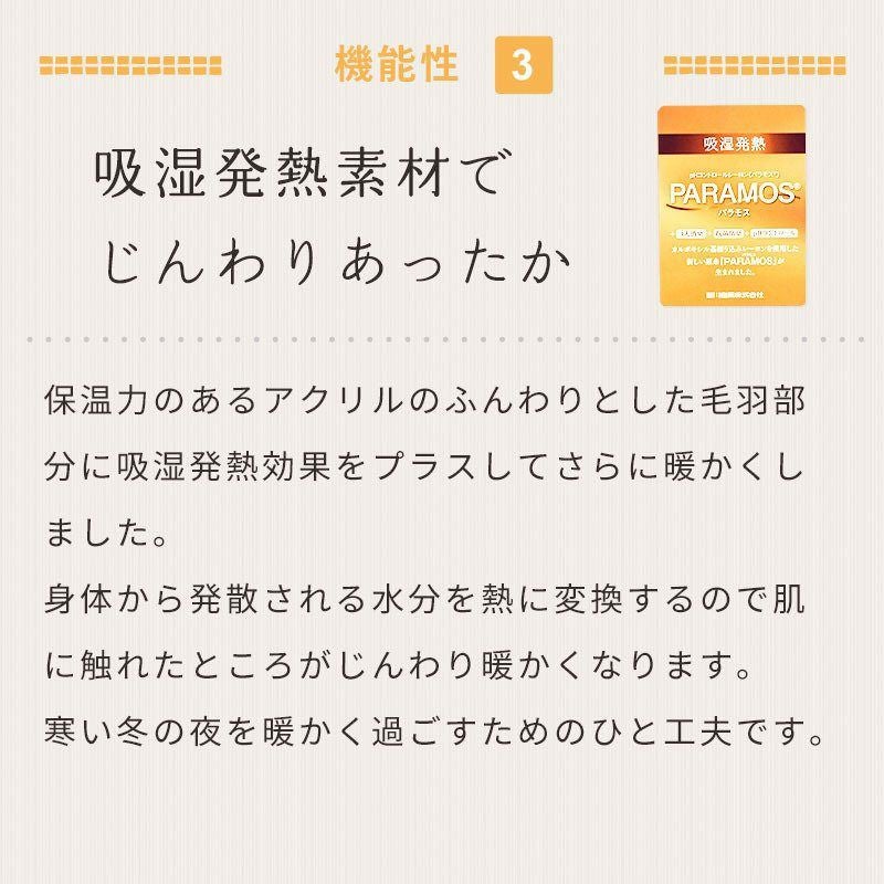 保温力のあるアクリルのふんわりとした毛羽部分に吸湿発熱効果をプラスしてさらに暖かくしました。身体から発散される水分を熱に変換するので肌に触れたところがじんわり暖かくなります。さらにSEKマークの基準に合格する抗菌防臭機能を備えていて、繊維上の菌の増殖を抑制します。また、静電気の嫌なパチパチ感を抑えます。