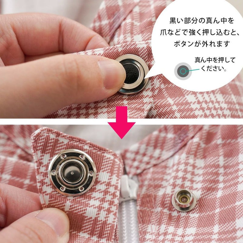 ファスナーのスライダー(つまみ)が付いていないので、要介護者が勝手にパジャマを脱いでオムツを外してしまう…といった心配もありません。付属の鍵を引っ掛けることで、ファスナーを開けられる仕組みになっています。また、ランナーを隠すためのカバーのボタンも引っ張るだけでは外れないので、二重に安心。