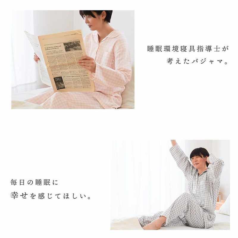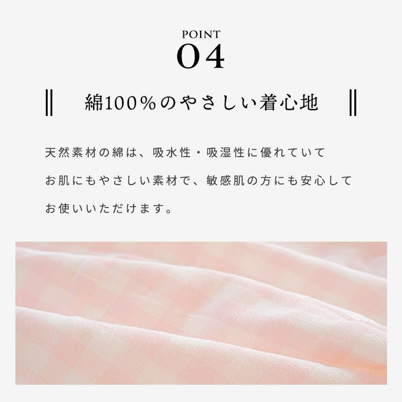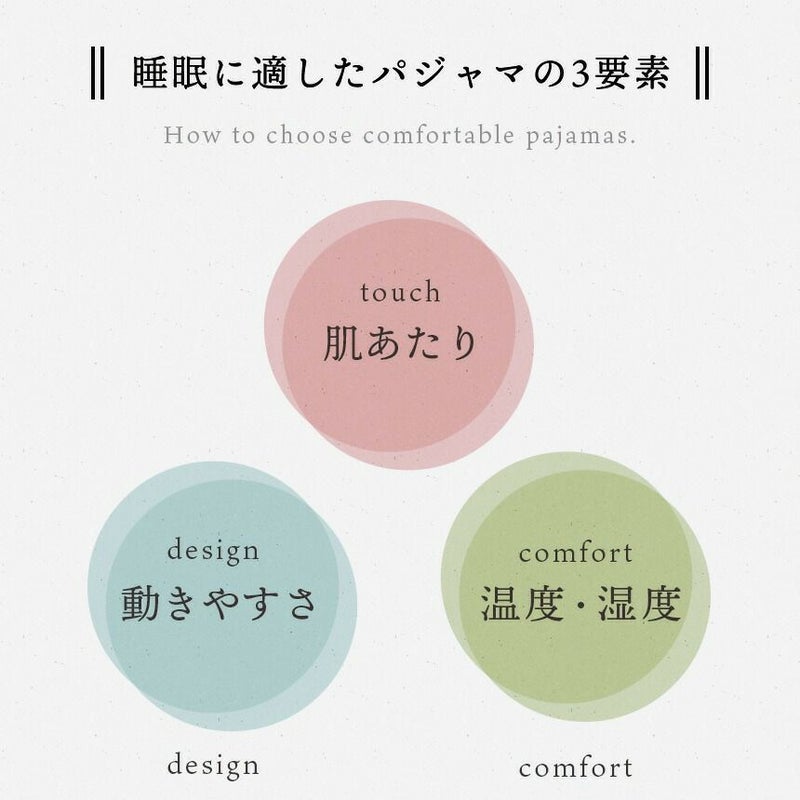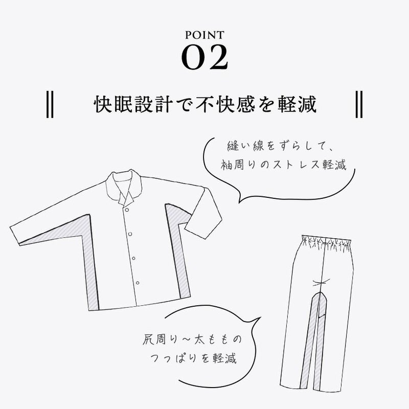 肌あたり…ソフトで肌触りが良く軽い着心地の無撚糸2重ガーゼ。 動きやすさ…縫い目にこだわることで寝返り時などの不快感を軽減。 温度・湿度…汗を吸収し衣服内の温度と湿度を快適に整える綿100%。