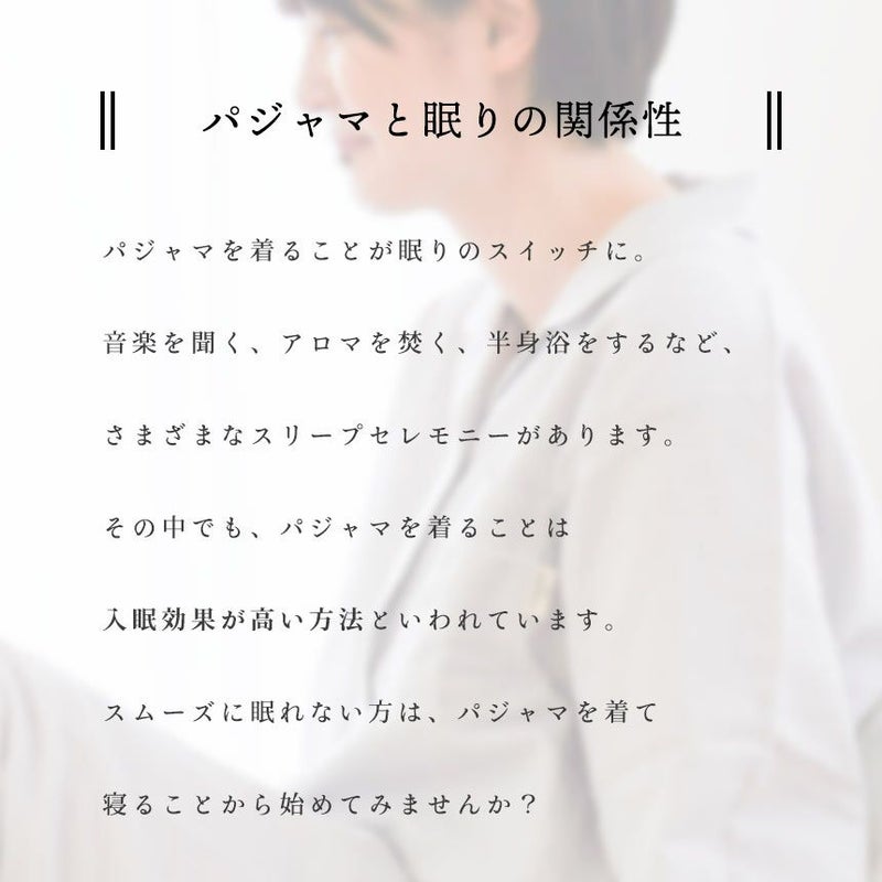 パジャマを着ることが眠りのスイッチに。音楽を聞く、アロマを焚く、半身浴をするなど、 さまざまなスリープセレモニーがあります。その中でも、パジャマを着ることは 入眠効果が高い方法といわれています。スムーズに眠れない方は、パジャマを着て 寝ることから始めてみませんか?