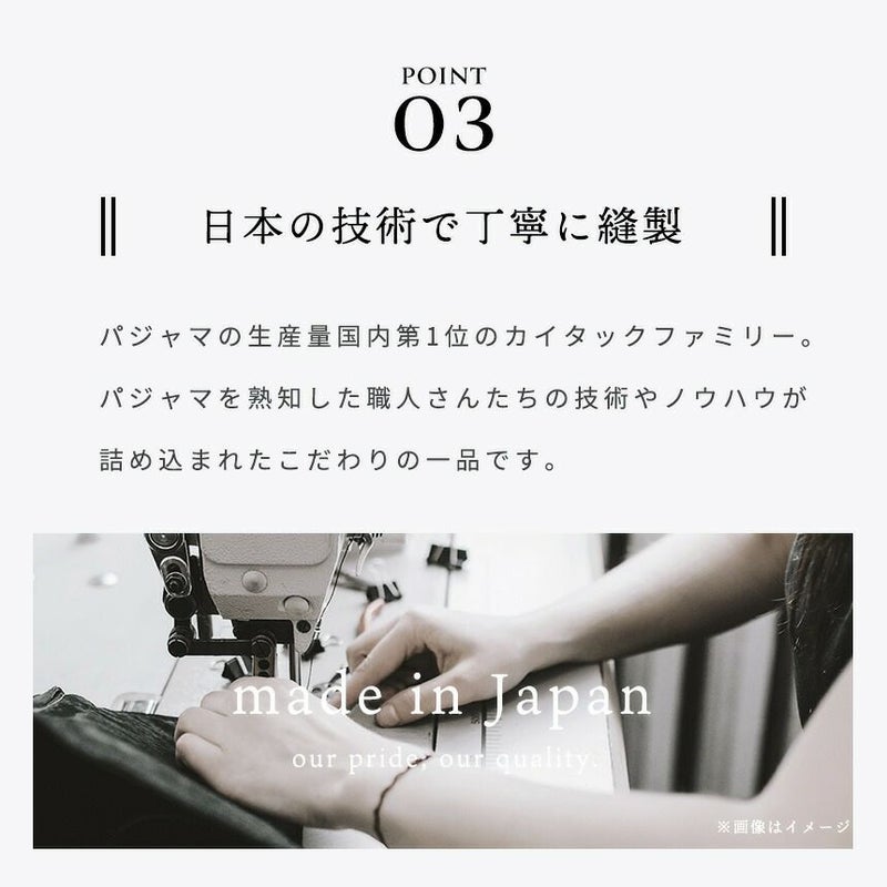パジャマの生産量国内第1位のカイタックファミリー。 パジャマを熟知した職人さんたちの技術やノウハウが詰め込まれた こだわりの一品です。