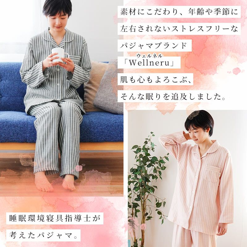 素材にこだわり、年齢や季節に左右されない、ストレスフリーなパジャマブランド「wellneru(ウェルネル)」。 睡眠環境寝具指導士が考えたパジャマで毎日の睡眠に幸せを感じてほしい。肌も心もよろこぶ、そんな眠りを追求しました。