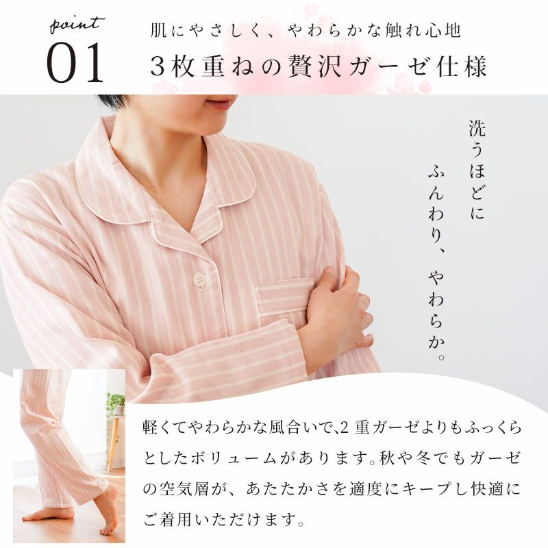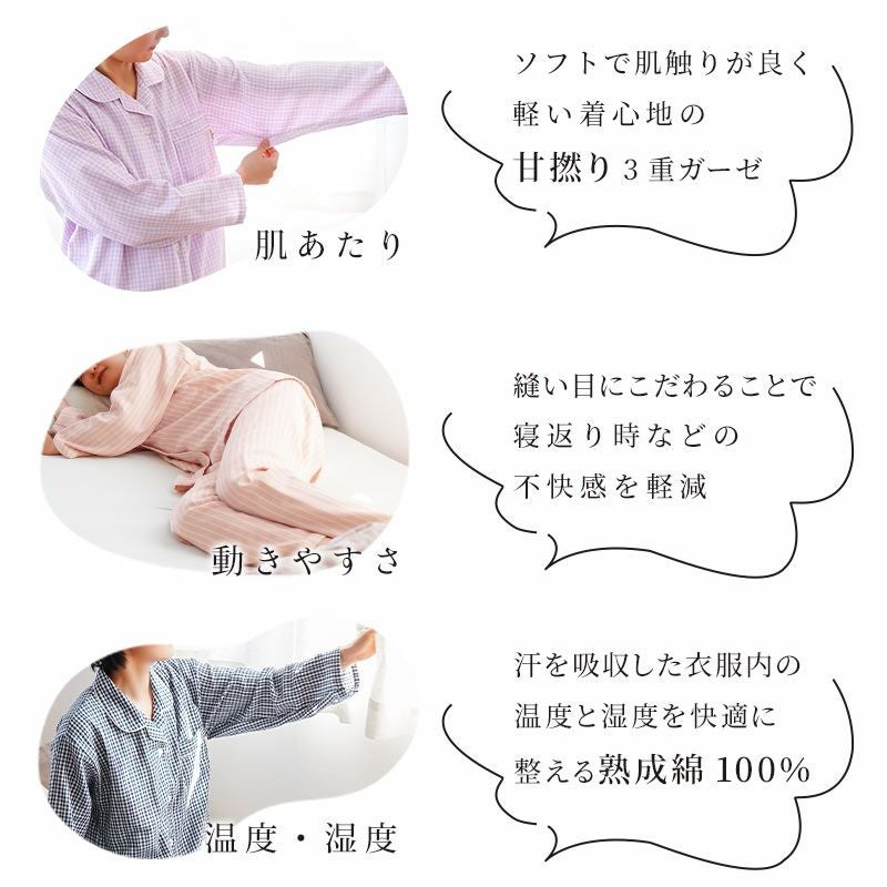 肌あたり…ソフトで肌触りが良く軽い着心地の甘撚り熟成綿100%3重ガーゼ。 動きやすさ…縫い目にこだわることで寝返り時などの不快感を軽減。 温度・湿度…汗を吸収し衣服内の温度と湿度を快適に整える綿100%。