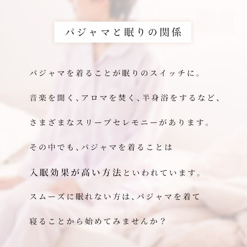 パジャマを着ることが眠りのスイッチに。音楽を聞く、アロマを焚く、半身浴をするなど、 さまざまなスリープセレモニーがあります。その中でも、パジャマを着ることは 入眠効果が高い方法といわれています。スムーズに眠れない方は、パジャマを着て 寝ることから初めてみませんか?