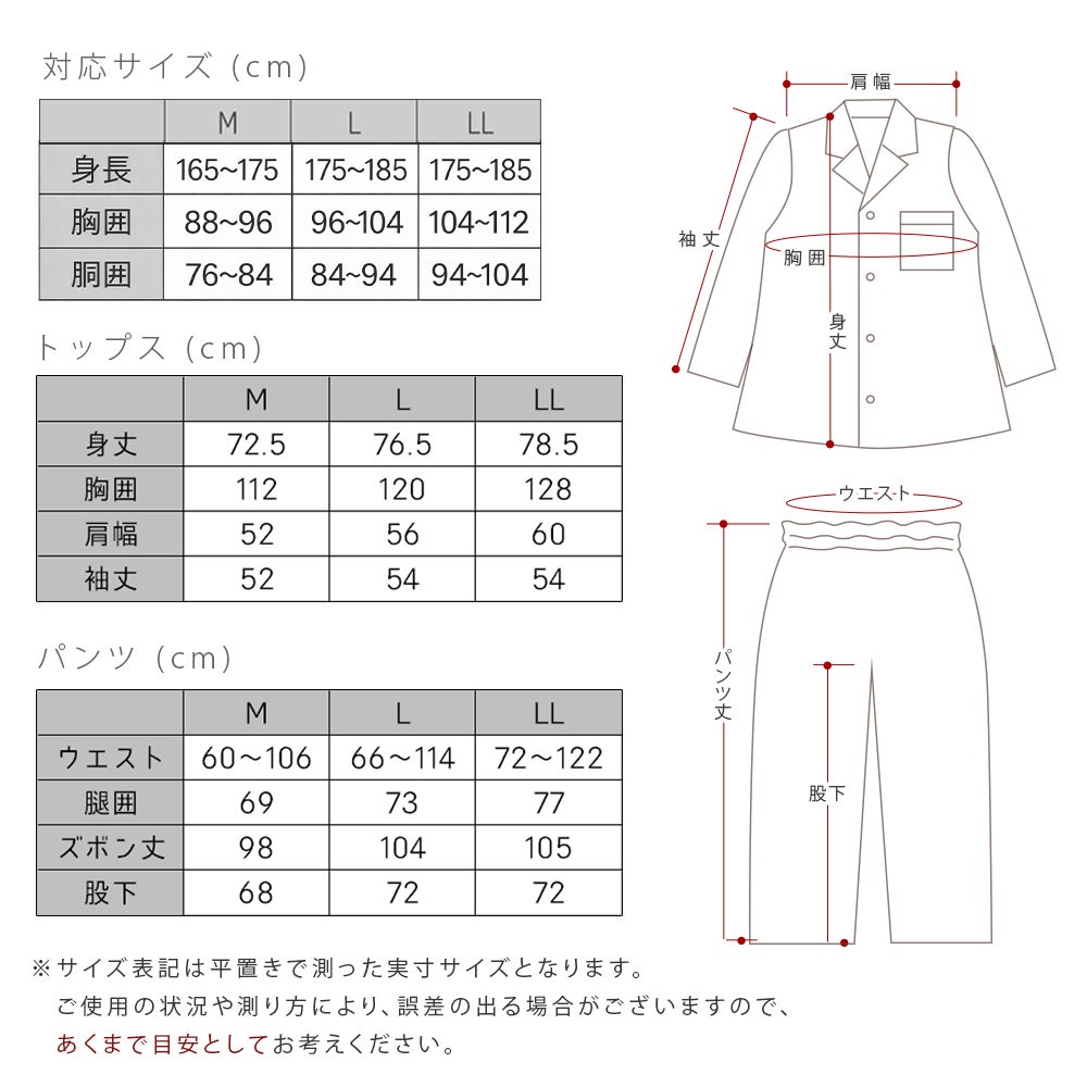 (身丈72.5cm、胸囲112cm、肩幅52cm、袖丈52cm、ウエスト60〜106cm、腿囲69cm、ズボン丈98cm、股下68cm)