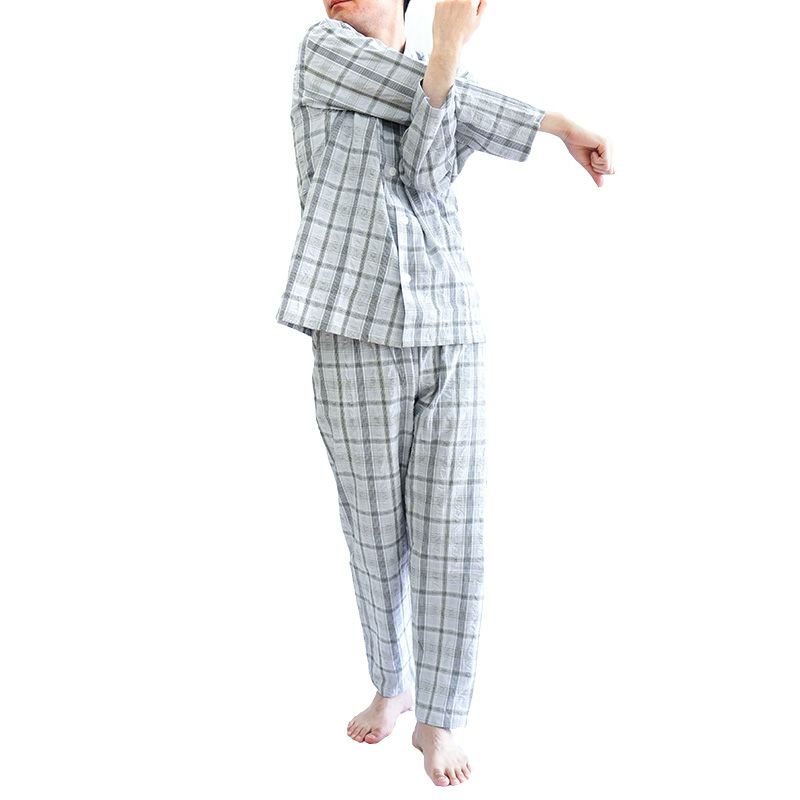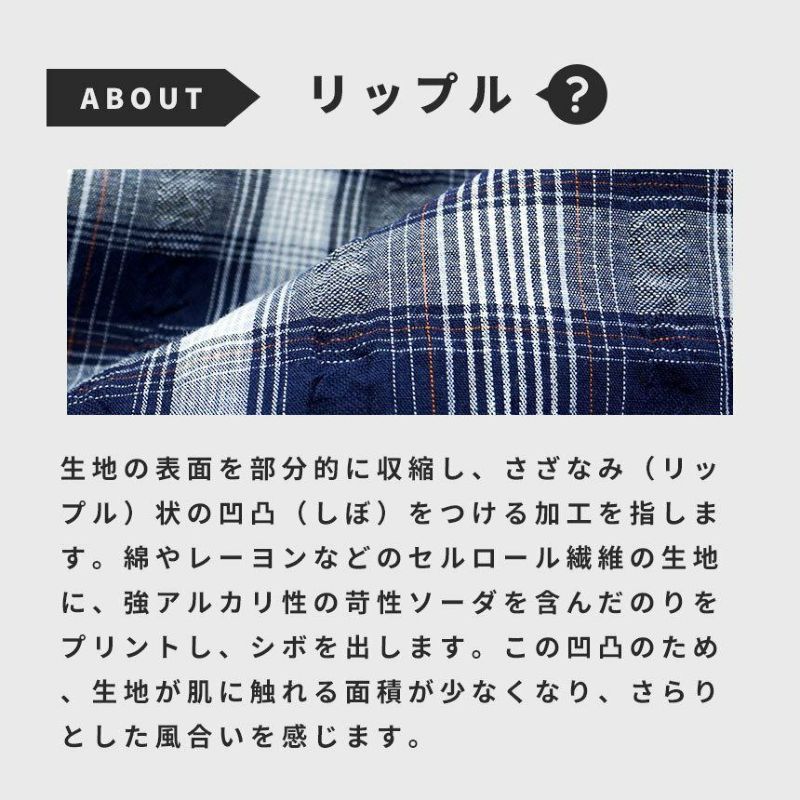 浴衣や甚平などにもよく用いられる、凹凸のあるリップル加工生地を使用。肌に触れる面積が少なくなり、さらりとした爽やかな感触に。長袖・長ズボンのセットアップです。